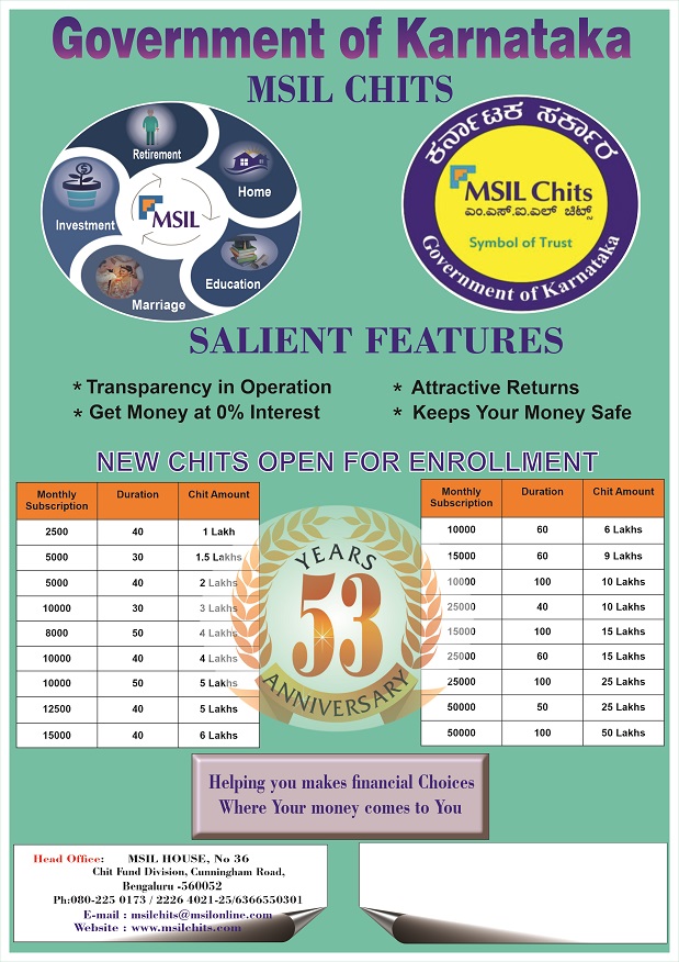Mysore Sales International Limited, a Government of Karnataka Undertaking established in the year 1966, is today a vibrant, multi-product, multi-dimensional marketing organization. MSIL started Chit Fund business in the year 2005 with an intention to bring social control over Chit Fund business so as to protect the public from being exploited by unregistered/unorganized chit operators.
